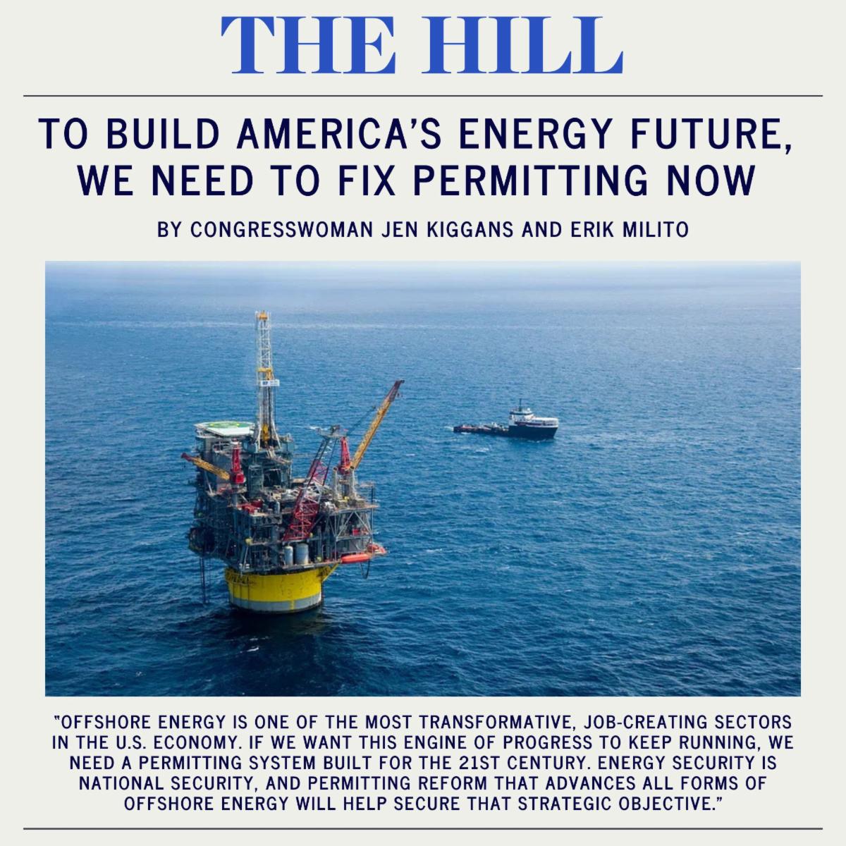 | You can also read an op-ed I wrote with the president of the National Ocean Industries Association, Erik Milito, titled “To build America’s energy future, we need to fix permitting now." From the Gulf Coast to the waters off the Commonwealth of Virginia, offshore energy is powering our economy and strengthening national security. But if we want this momentum to last through future administrations, we must fix our broken permitting system. | |