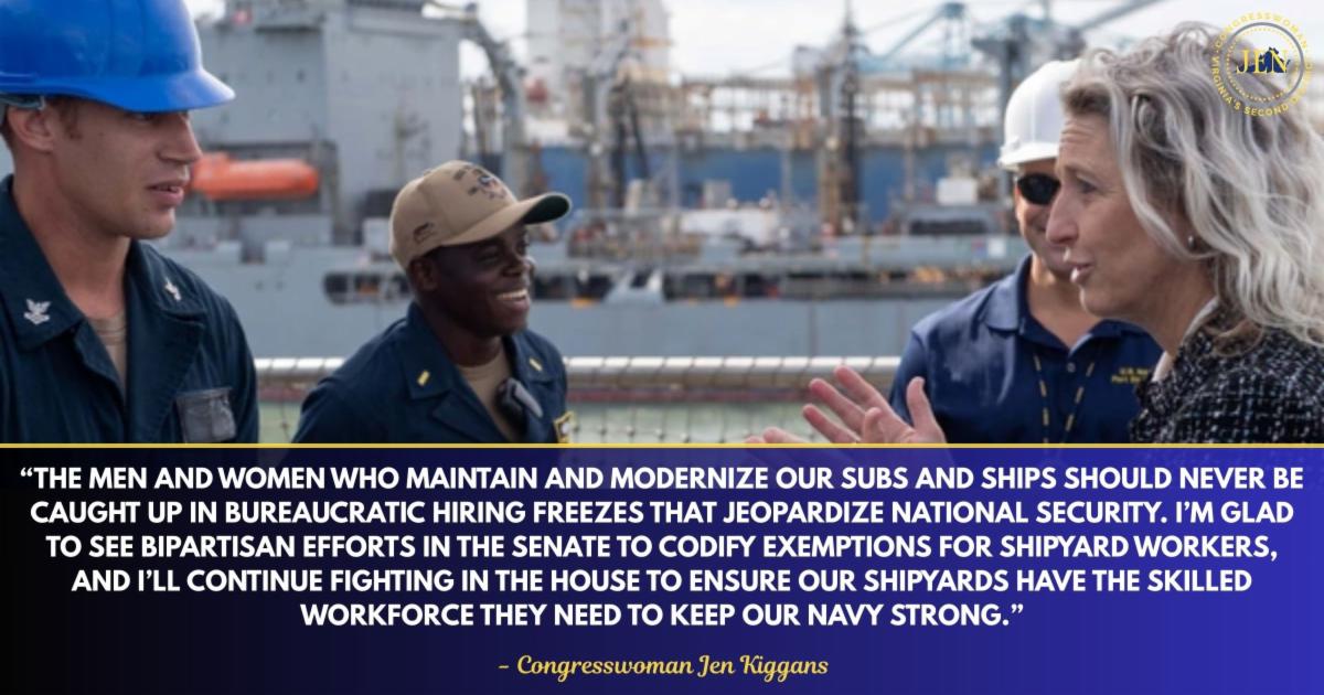 As a Navy veteran and representative of thousands of shipyard workers in Hampton Roads, I know firsthand that America’s public shipyards are the backbone of our fleet readiness. The men and women who maintain and modernize our subs and ships should never be caught up in bureaucratic hiring freezes that jeopardize national security. I’m glad to see bipartisan efforts in the Senate to codify exemptions for shipyard workers, and I’ll continue fighting in the House to ensure our shipyards have the skilled workforce they need to keep our Navy strong.