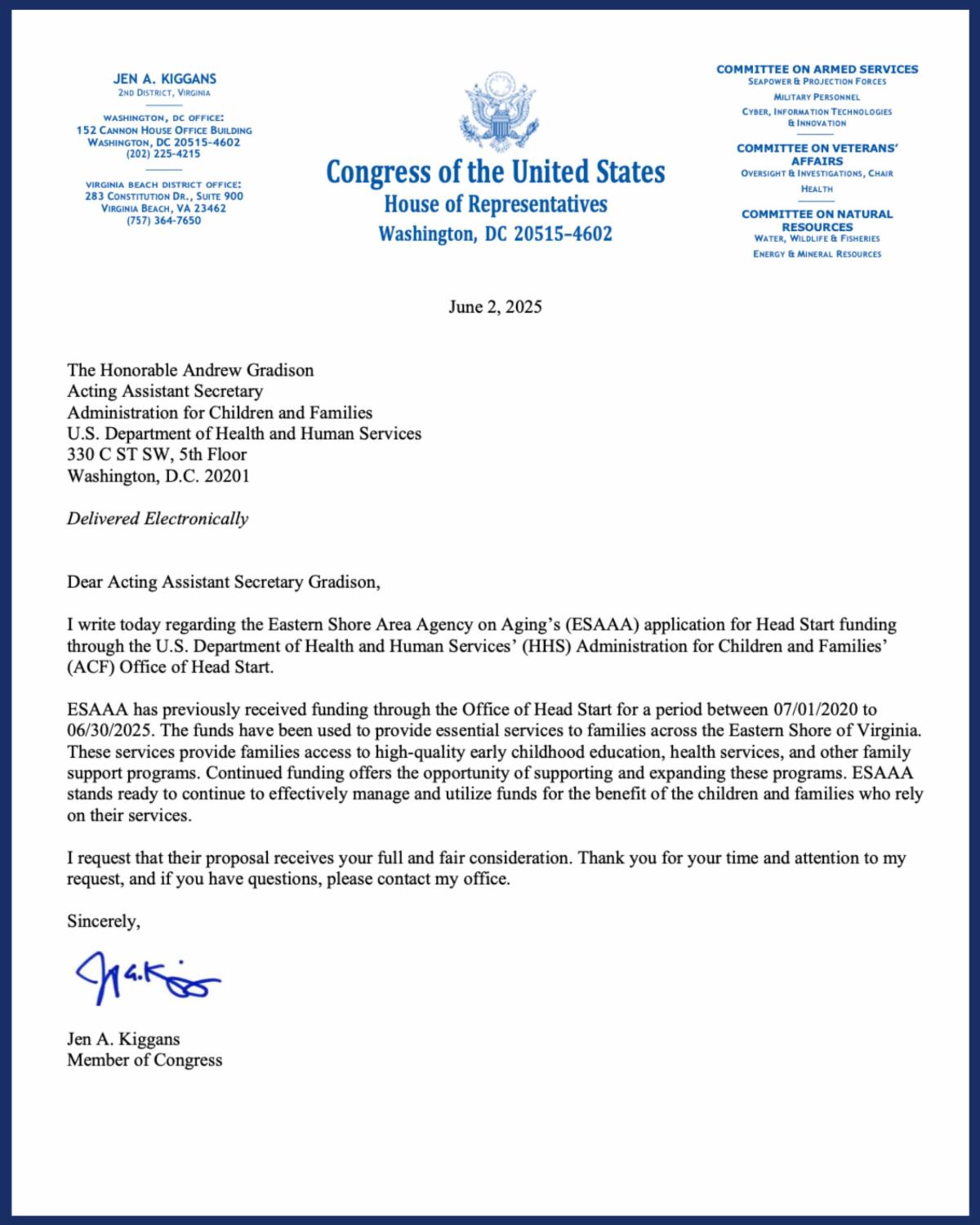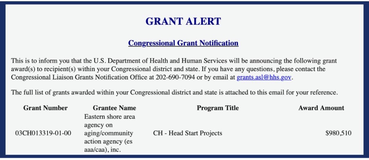 I’m proud to share that the Eastern Shore Area Agency on Aging (ESAAA) has been awarded $980,510 in Head Start funding through the U.S. Department of Health and Human Services. Last month, I wrote a letter to the Administration for Children and Families in strong support of ESAAA’s application—and I’m grateful that they granted my request.