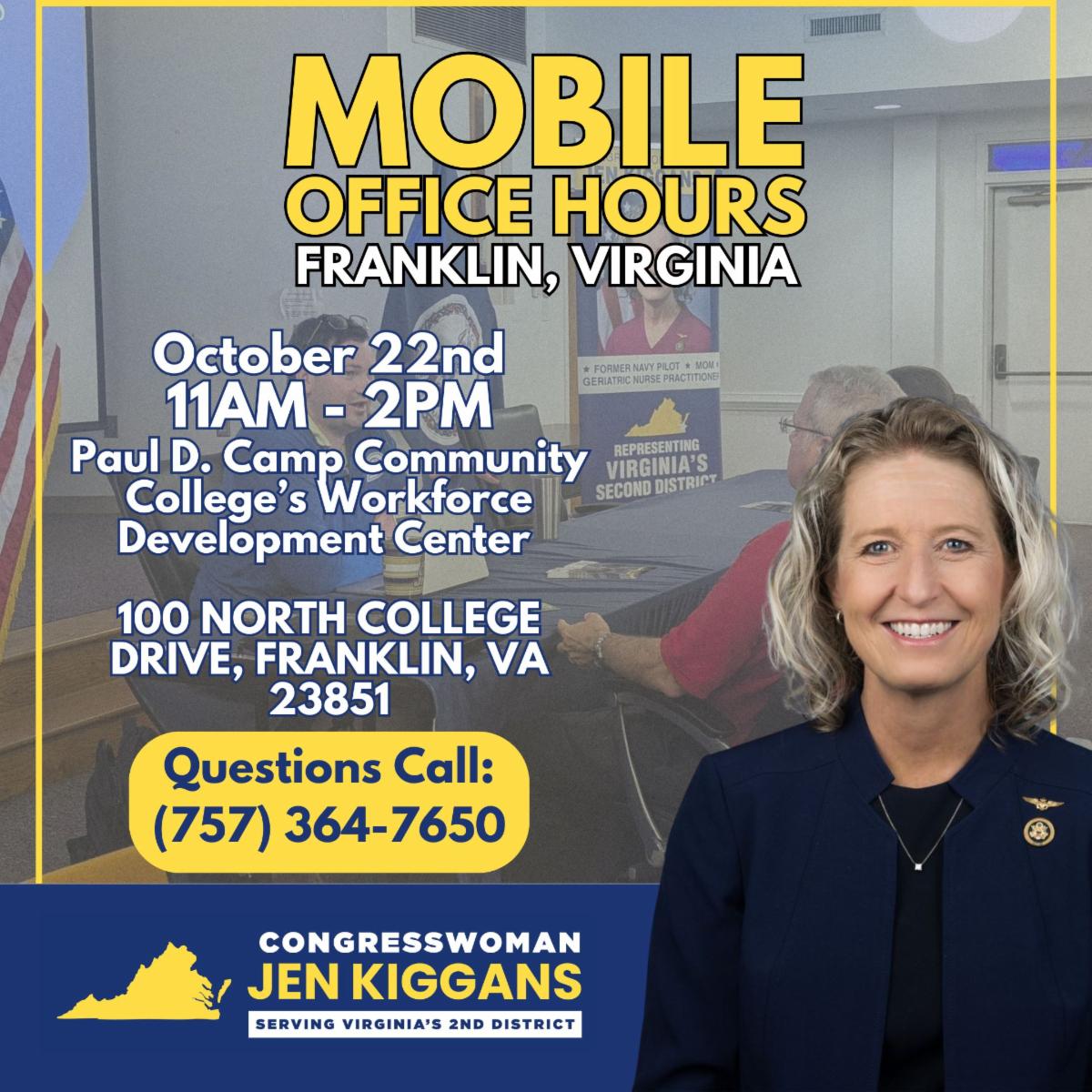 Team Kiggans is hitting the road again! My staff will be hosting Mobile Office Hours on Wednesday, October 22nd from 11:00 AM to 2:00 PM at Paul D. Camp Community College's Workforce Development Center (100 North College Drive, Franklin, VA 23851).