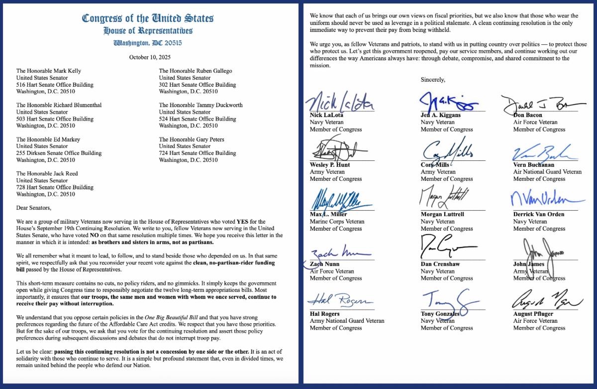 This week, I joined Congressman Nick LaLota (NY-01) and fourteen of our fellow veteran Members of Congress in sending a letter to the seven veteran senators who voted NO on the House-passed bill to keep our government open. We reached out not as members of our respective political parties, but as veterans who took the same oath to serve our country.