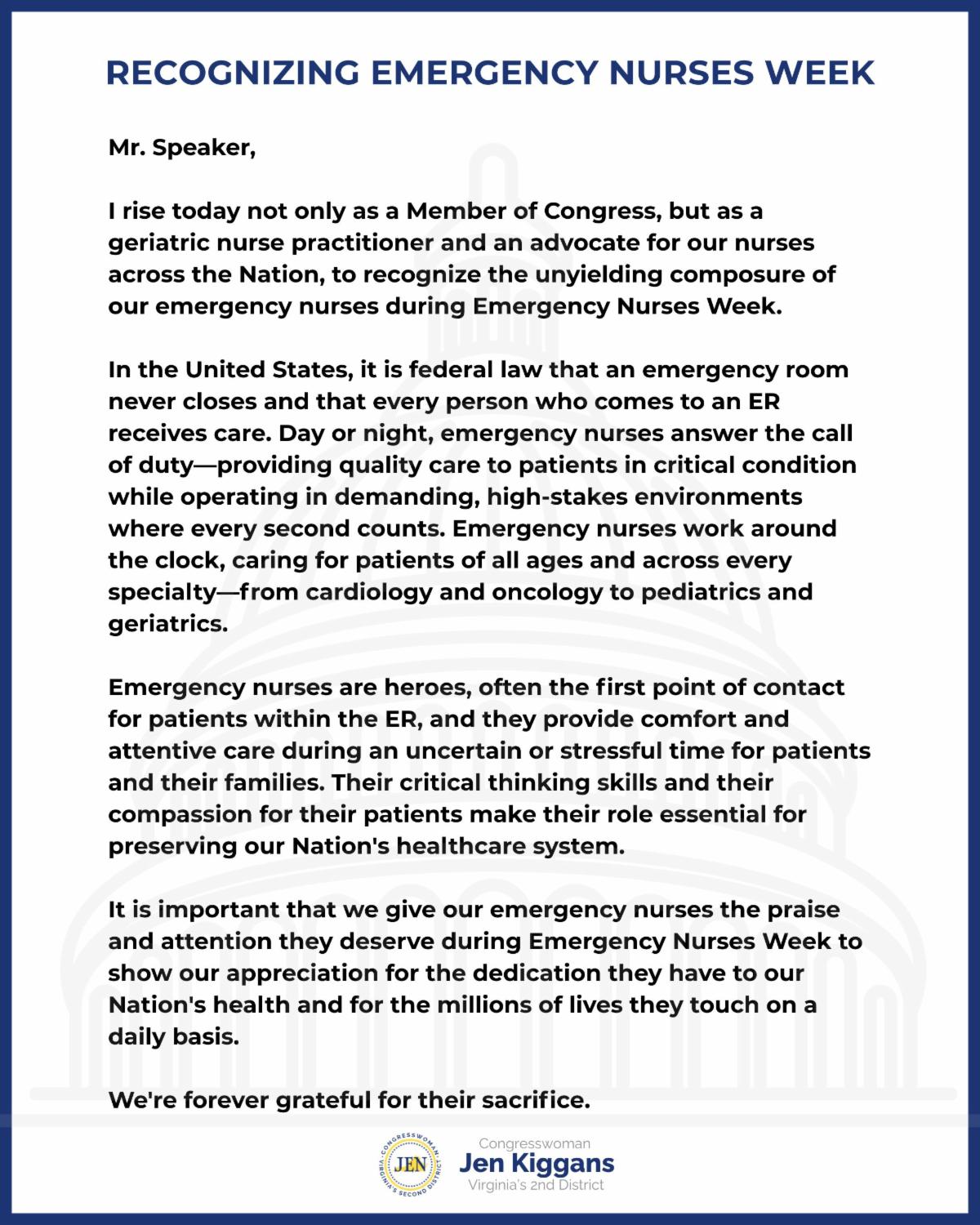 Recently, I submitted a Congressional Record recognizing Emergency Nurses Week. As a nurse practitioner, I have tremendous respect and gratitude for the men and women who answer the call—day and night—to provide lifesaving care in our nation’s emergency rooms.