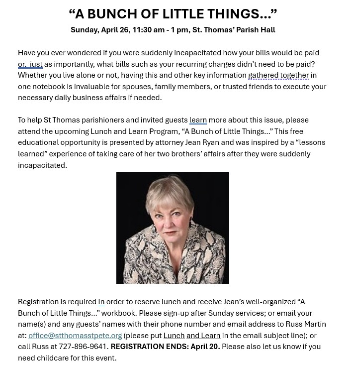 Is there something you would like published in our weekly e-newsletter? For consideration, please email your submission to office@stthomasstpete.org no later than end of business on Tuesday.