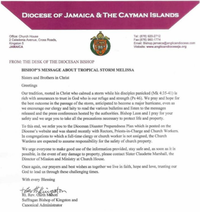 With 175 mile per hour winds, Melissa slammed into Jamaica and then went on to hit Cuba. There are three Anglican churches in Jamaica: St. James's-Montego Bay, St. Margaret-Kingston, and St. Margaret's-Liguanea and Holy Trinity Cathedral-Cuba. Damage is still being assessed. If you are interested in helping, please visit Episcopal Relief and Development: episcopalrelief.org.