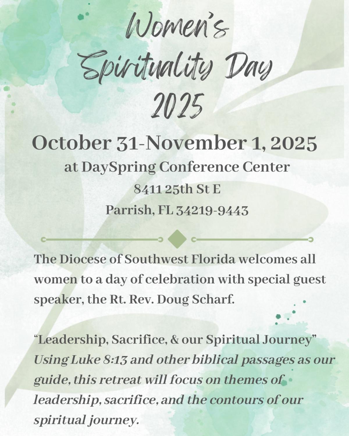 Join women from across the Diocese for a day of reflection, renewal, and community at DaySpring Conference Center in Parrish! Friday, Oct. 31 (4:30 p.m.) – Saturday, Nov. 1 (3:00 p.m.) DaySpring Conference Center, 8411 25th St E, Parrish, FL.