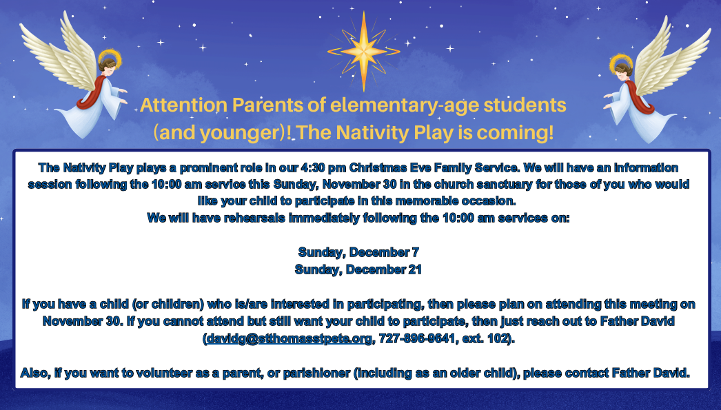 The Nativity Play is an important part of the 4:30 pm Christas Eve Family Service at Saint Thomas, and I hope you will consider having your child be a part of it! I will run an information session for parents who would like their young children (elementary age or younger) to participate in this wonderful experience! We will meet right after the 10:00 am service in the church sanctuary this Sunday, November 30. If you are unable to make this meeting but want your child to participate, then just reach out to me.