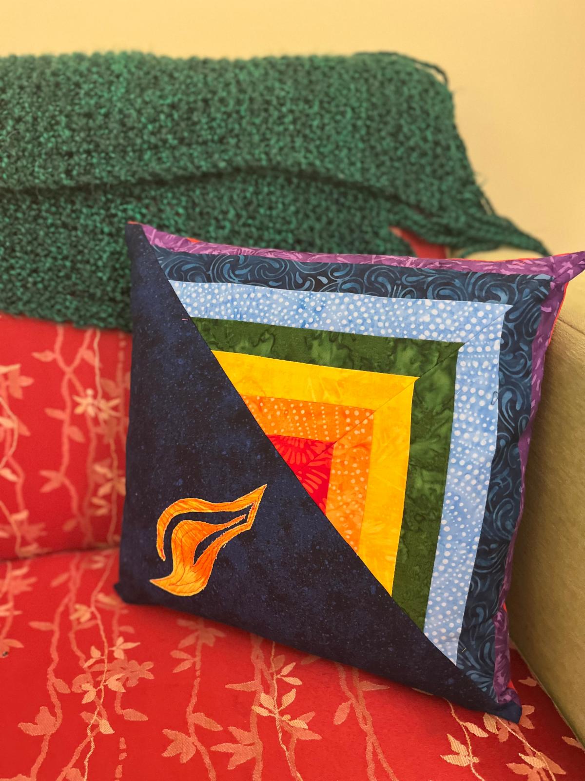"Our wish is that you keep this pillow as a reminder of our love, and as an opportunity to stay grounded in your own beliefs. When you need someone to hug, or someone to hug you, find comfort and connection in this pillow, the physical embodiment of our presence with you always. When you need a moment of beauty, joy, and light, turn towards this pillow and see the caring gorgeousness created just for you by our congregation. Take this pillow with you wherever you go, and remember the love and faith that are in this gift – they are here for you whenever you need them. When you hold this pillow, we hope you’ll remember all the lessons we have learned together and the comfort that can be found in religious community."