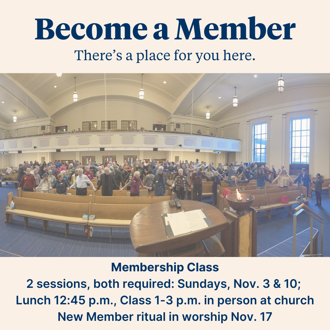 Joining First Universalist is a symbolic, spiritual act of saying “yes” to growing your soul in this place, with these people, within our free faith tradition. Our membership class offers a chance to inform yourself about the ministry areas of the church through online videos, then be in community with other new members to identify and articulate what relevant, sustainable, and long-term membership will look like for you, and sign the membership book- officially join the church. (Please note, an online membership class option will be offered in spring 2025.) Facilitated by Membership Coordinator Liz Farmer and Board Members.