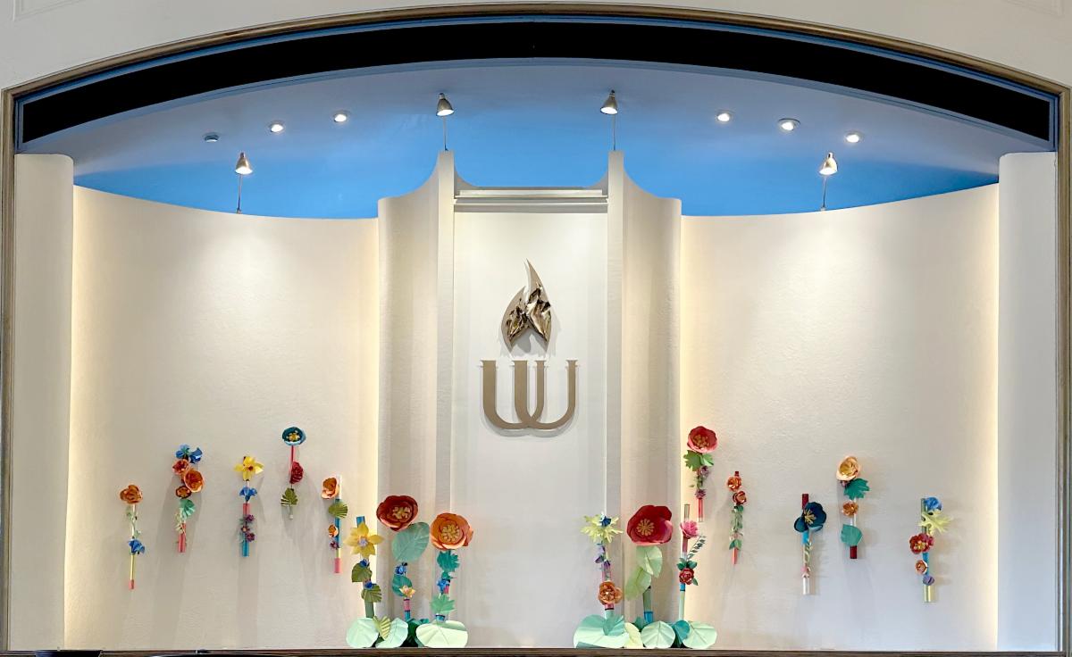 The Visual Arts Committee created flower poles by combining decorations they had previously used. They used wrapped colorful fabrics on tubes from previous holiday decorations. The flowers were created two years ago for a spring garden scene. Zoe Harrison (a new Visual Arts member and First U youth) helped develop the plan.