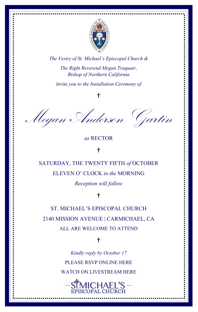 Rev. Megan will be available on request. Please email revmegan@stmichaelscarmichael.org to schedule.