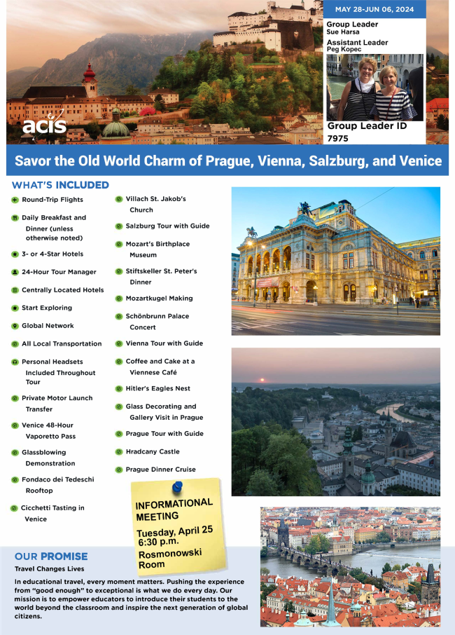 This year's trip is May 28 to June 6, 2024, in Prague, Vienna, Salzburg, and Venice.