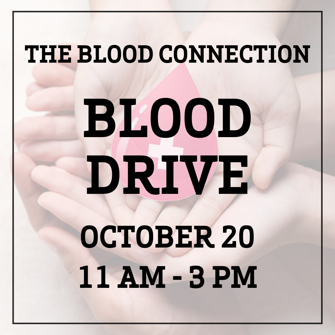 We are partnering with The Blood Connection to sponsor a blood drive on Sunday, October 20th from 11 AM - 3 PM. Each blood donation saves up to 3 lives! Donors need to be at least 16 years old (16 & 17-year-olds need a permission slip which will be at the blood drive), weigh at least 110 pounds, have ID and be in general good health.