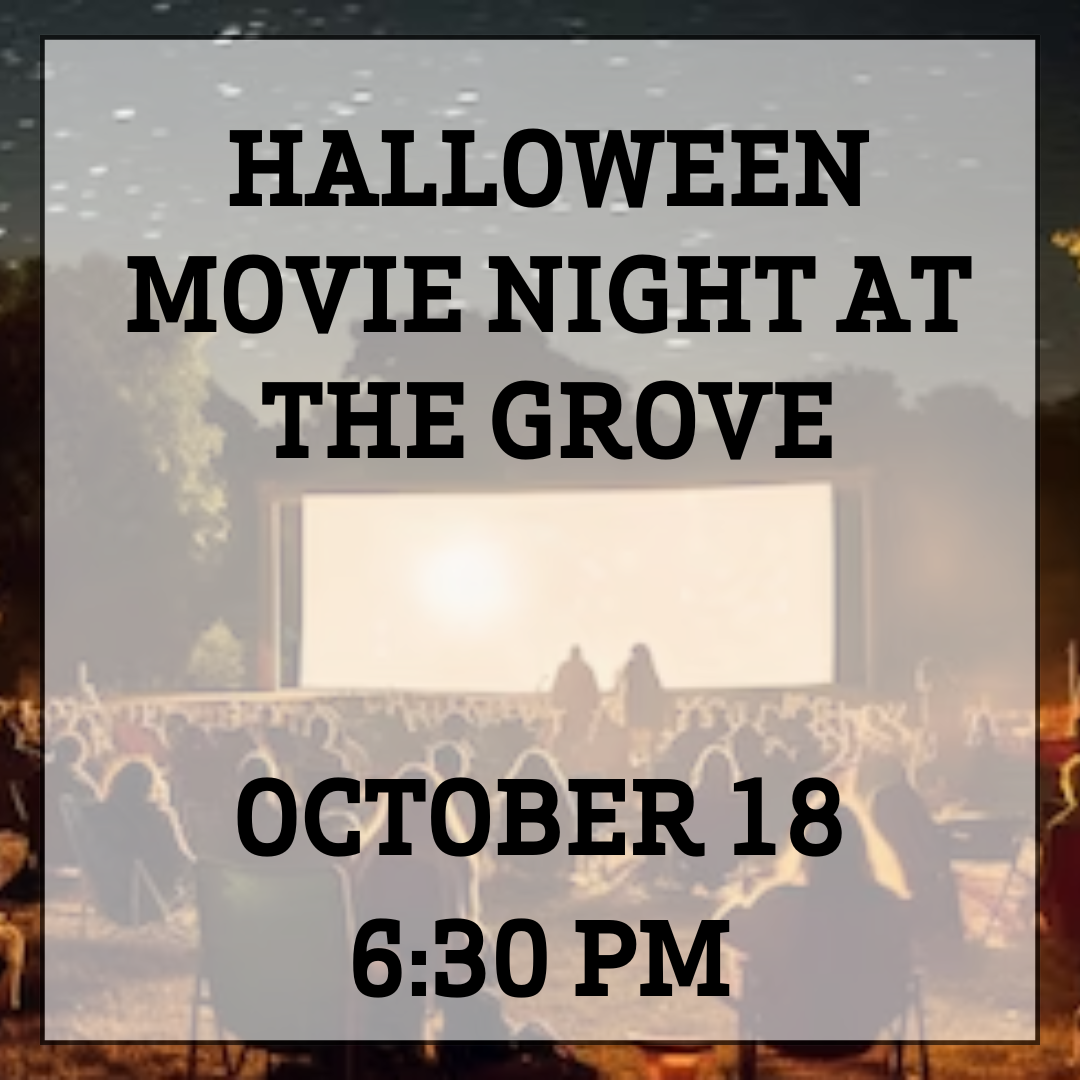 Join us on Friday, October 18th, at 6:30 PM at Grove Park for a Halloween Movie Night! We’ll be showing the family-friendly movie Hotel Transylvania. Bring your blanket or lawn chair for a fun and cozy evening outdoors.