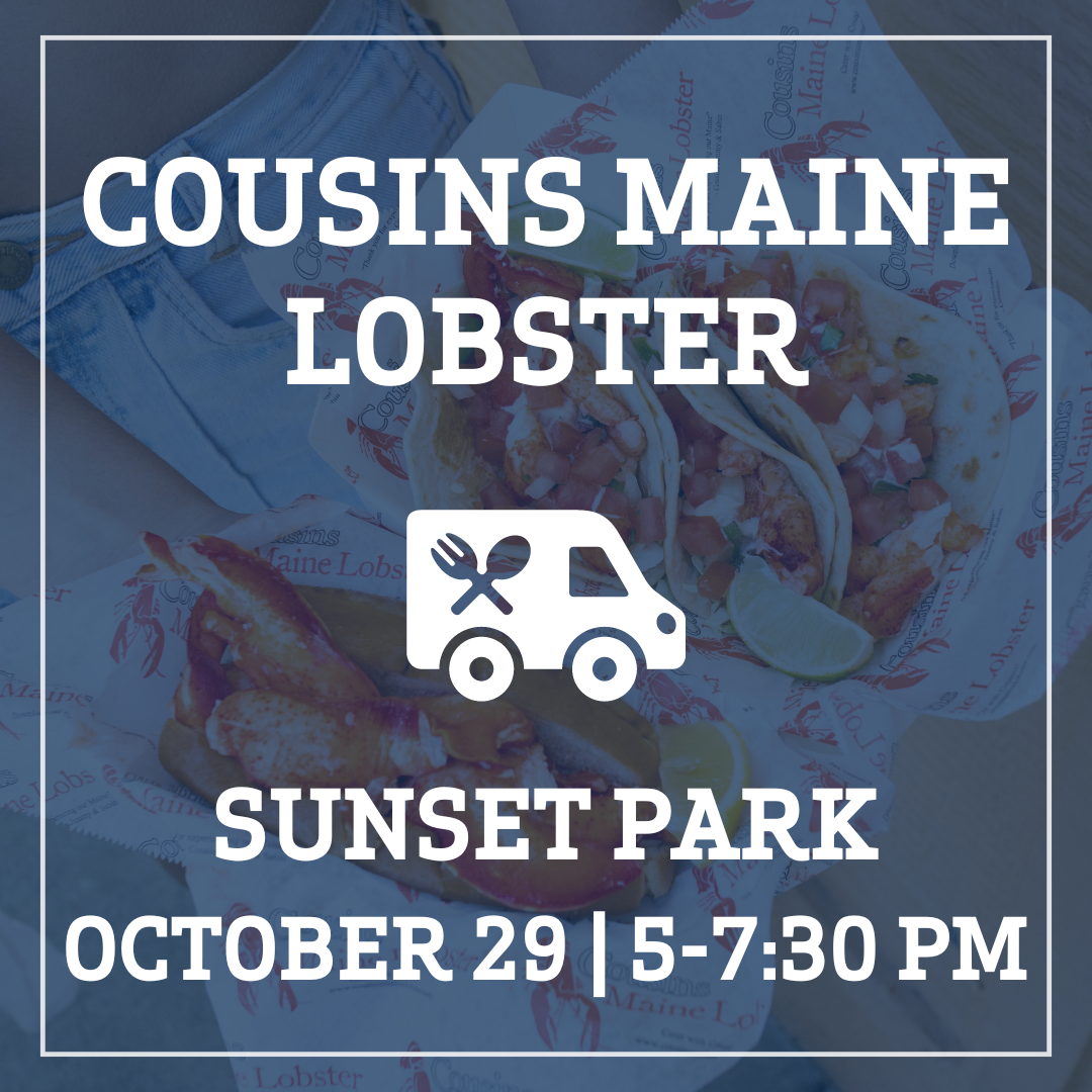 The Cousins Maine Lobster food truck will be at Sunset Park on October 29, from 5 to 7:30 PM, serving up some delicious food for dinner!