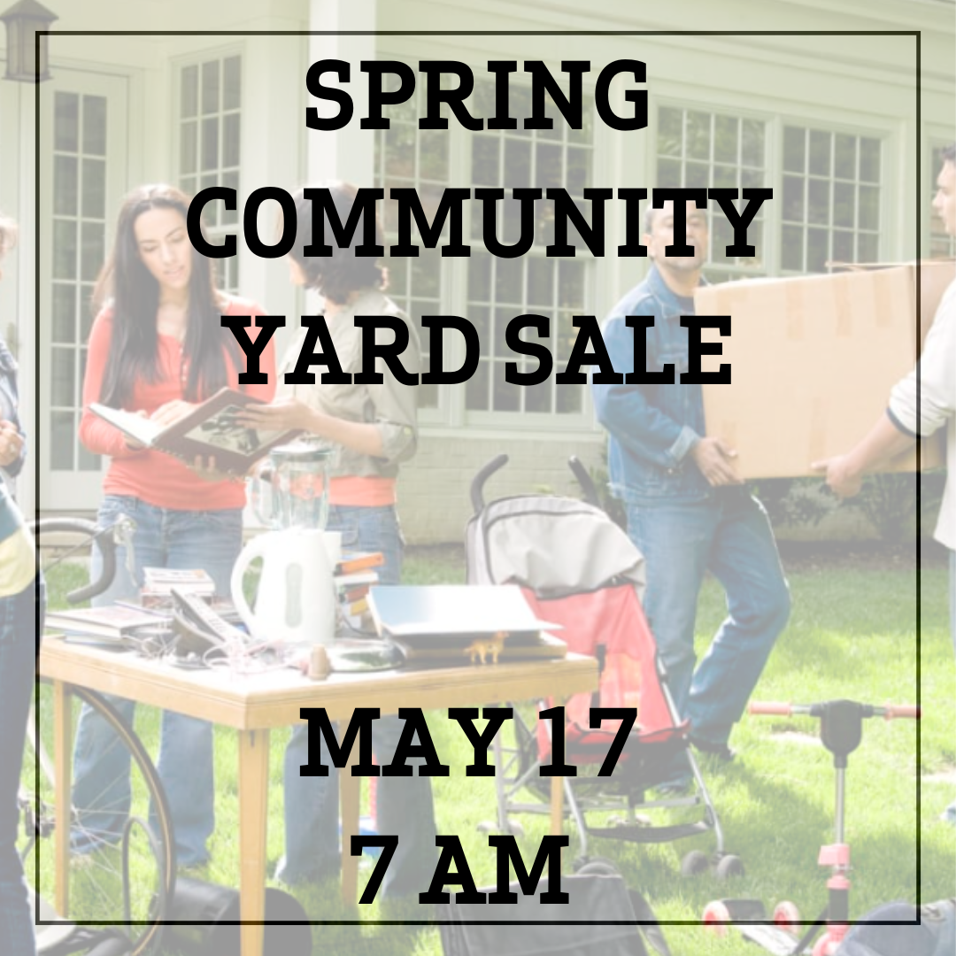 Mark your calendars for the Spring Community Yard Sale on Saturday, May 17th, starting at 7 AM! It’s the perfect chance to do some spring cleaning, uncover great deals, and connect with neighbors. Whether you're on the hunt for hidden treasures or ready to sell gently used items, this event is for you. Set up your tables early and enjoy a morning of shopping, selling, and community fun! The last day to sign up is Monday, May 5th. |
