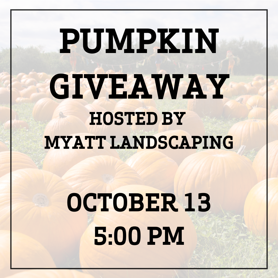 It's time for our annual pumpkin giveaway with Myatt Landscaping! Stop by Grove Park on Monday, October 13, at 5 PM to pick up a free pumpkin!