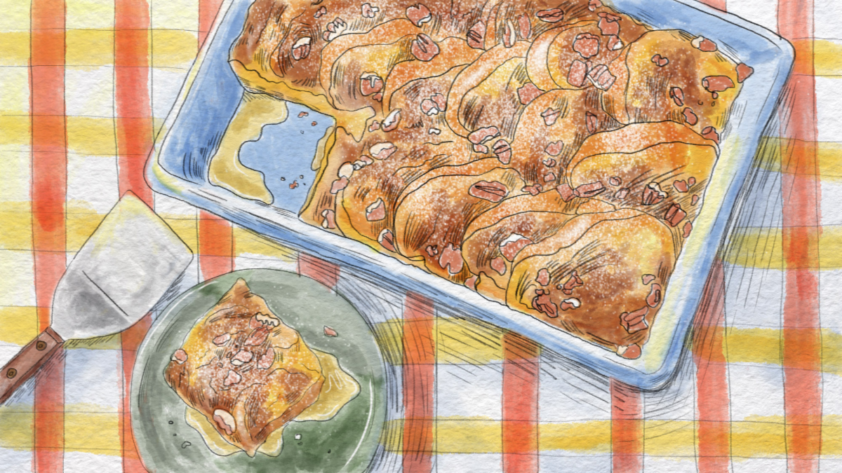 Mix butter and brown sugar and place small scoops all around the casserole.