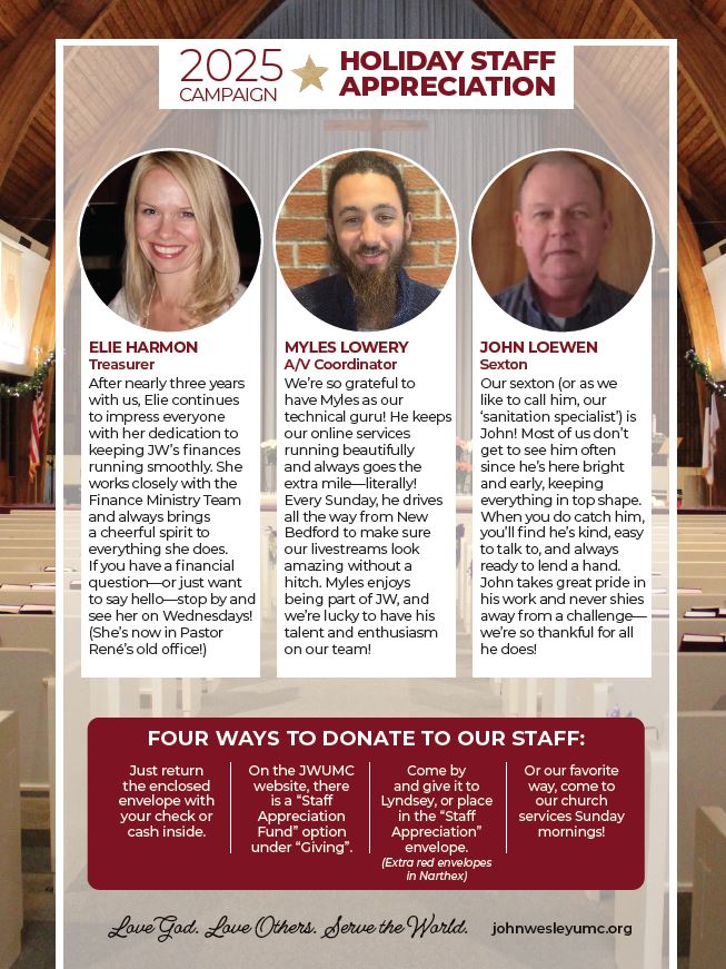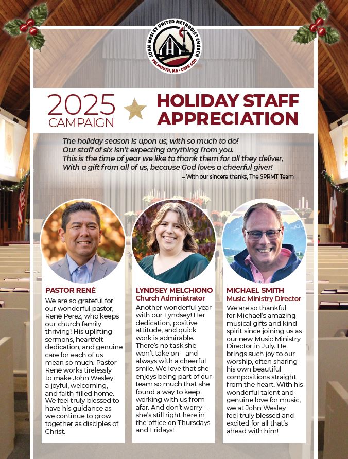 Staff Parish Relations Ministry Team is kicking off our annual staff appreciation campaign this week. Over the next three weeks we ask the congregation consideration in supporting this campaign. We have an outstanding staff that ensures John Wesley functions flawlessly on a daily basis.