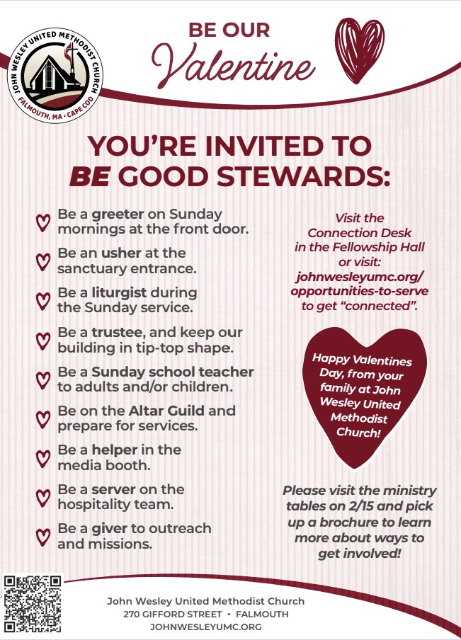 Greeters are the first impression to our church. You can choose to greet monthly/seasonally. There is availability to pick which Sunday of the month works best for you. You could also choose to be a substitute. If you are interested in being part of the JW welcome, contact Karen Camp 508-737-1636 or nerakpmac13@gmail.com.