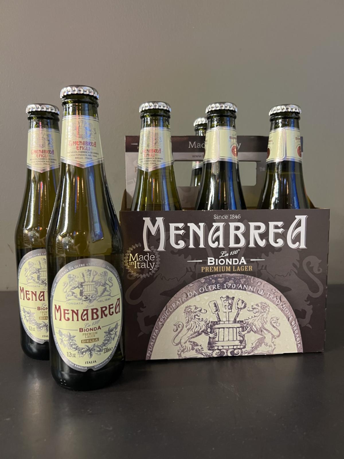 "Menabrea Blonda (or Bionda) is a premium Italian lager beer with a 4.8% ABV, characterized by its pale-golden color, a balanced taste of malt, citrus, and floral notes with a crisp, clean finish, and a floral-fruity aroma. Brewed in Biella, Italy, using high-quality ingredients and matured in cave cellars, it is known for its well-balanced flavor profile and suitability to be paired with Italian cuisine. "
