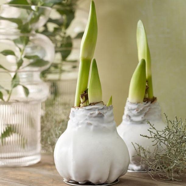 Waxed amaryllis bulbs are super easy to grow as they require neither water nor soil. A note of caution, however, the wax-coated amaryllis are designed to be single-season décor. The wax seals the bulb so it cannot absorb water, grow roots, or store energy. That means you cannot keep them growing long-term unless you remove the wax. But the good news is, with a bit of careful work, you can sometimes save and rebloom them!