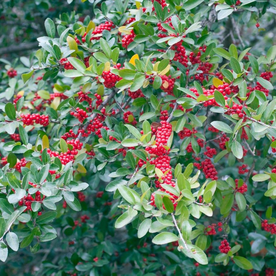 Ilex vomitoria, commonly known as yaupon holly, is a native shrub or small tree found throughout the southeastern United States and extending into Mexico. Indigenous peoples brewed a tea from the leaves; when consumed in large quantities, it could induce vomiting, hence the specific epithet vomitoria.