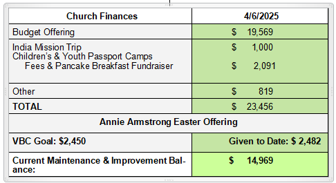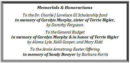 Thank you for helping us reach our Annie Armstrong Easter Offering church goal of $2,450! This campaign will continue through the end of April, so it's not too late to support missionary efforts across the United States and Canada. There are special envelopes in your box of envelopes and also in the pew pockets in the sanctuary. You may also give online and designate your gift for Annie Armstrong.