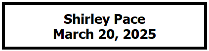 Christian sympathy is extended to the family and friends of Shirley Pace, who passed away March 20th; and to Brian & Andrea Lafferty and family in the sudden death of his niece, Stacie Bolen.