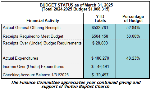 The RVBA Spring Associational Meeting is Tuesday, April 29th at 6:30 PM at Bonsack Baptist Church, and we need several volunteers who are able to attend and who would represent Vinton Baptist as messengers. If you are available, please contact Patsy Talbert in the church office at 540-343-7685. Thank you!