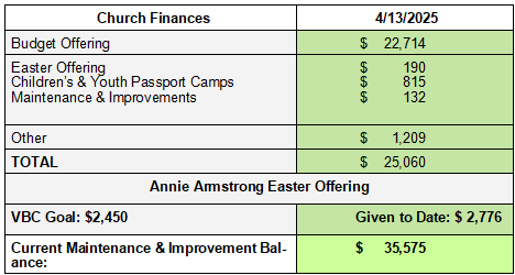 Thank you for helping us meet and exceed our Annie Armstrong Easter Offering church goal of $2,450! This campaign will continue through the end of April, so it's not too late to support missionary efforts across the United States and Canada. There are special envelopes in your box of envelopes and also in the pew pockets in the sanctuary.
