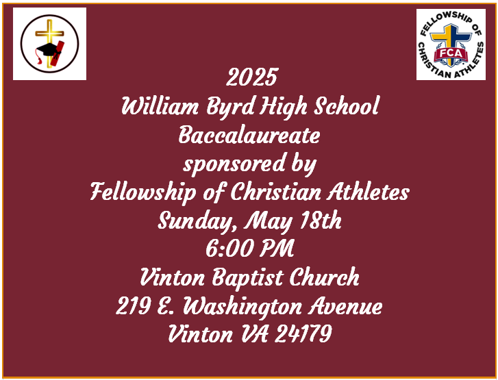 Graduate Recognition Sunday is May 18th. If you or someone in your family is graduating from high school, college, grad school, or technical school this year, please email kim@vintonbaptistchurch.org or call the church office at 540-343-7685 to let us know the following: name of graduate, school, any special honors, type of degree, future plans, and whether they will be able to attend worship May 18th. If your graduate cannot attend May 18th, we would still like to have their information so that we can recognize them in The Witness. If your graduate will attend on Graduate Sunday, they should wear their graduation regalia and meet Whitney Russell in the church library at 10:00 AM on May 18th.