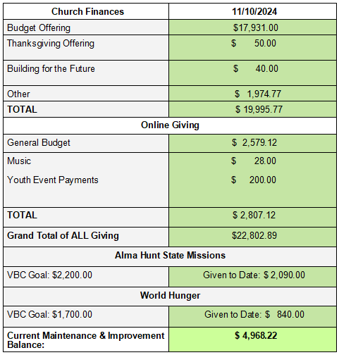 - Children's Choirs, Youth Missions Group, and Chancel Choir Rehearsal will continue each Wednesday through December 11th, EXCEPT for November 27th (the night before Thanksgiving), when we will have no activities.