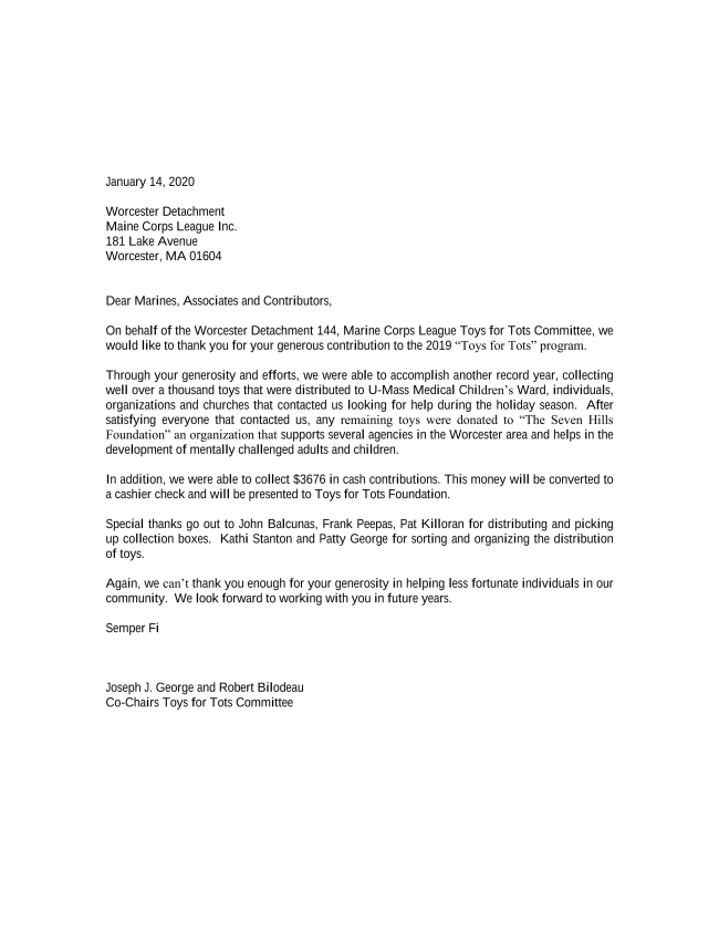 On behalf of the Worcester Detachment 144, Marine Corps League Toys for Tots Committee, we would like to thank you for your generous contribution to the 2019 “Toys for Tots” program.
