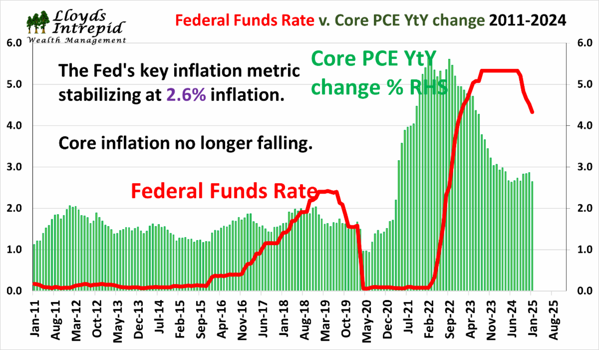Finally, there are private sources of inflation data that predict an imminent fall in inflation. The Truflation index was created to track thousands of items on the internet to measure short term trends in inflation. As you can see below, this indicator hints that lower inflation numbers are just ahead of us in 2025.