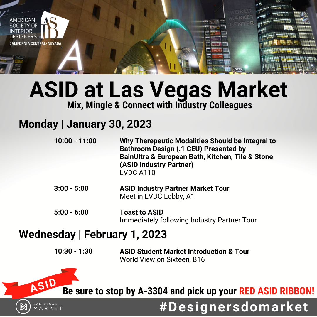 Remember to wear your ASID badge ribbon at Las Vegas Market and KBIS. Ribbons can be picked up at the ASID Chapter Offices on the third floor of Building A (A3304) or the Front desk of Building A.