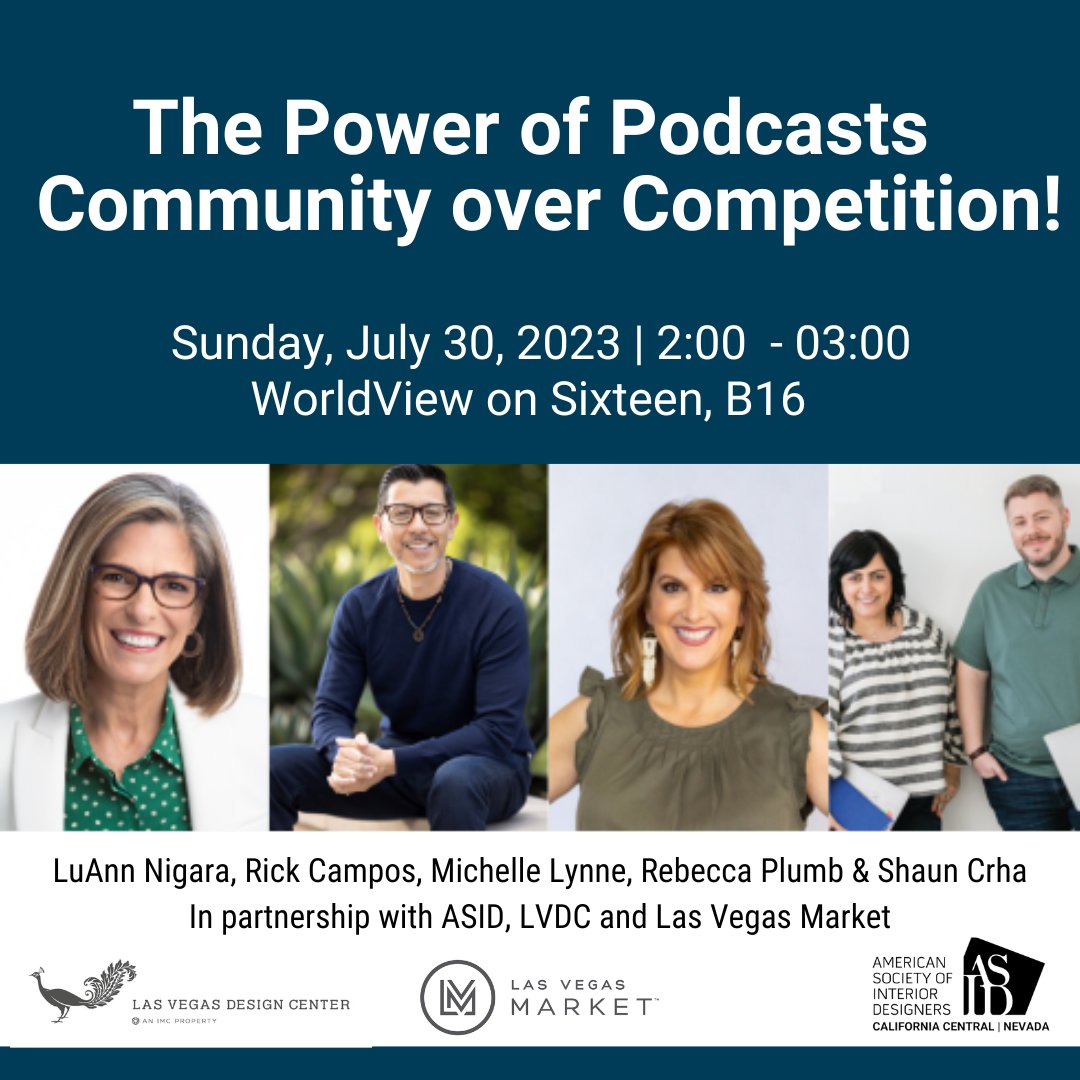 Celebrated media personality LuAnn Nigara, business leader, host and founder of A Well-Designed Business® Podcast, will moderate this discussion with Rick Campos, host & founder of Design Biz Survival Guide Podcast; Michelle Lynne, business coach and host of The Designed for the Creative Mind Podcast; and the hosts and founders of Hot Young Designers Club Podcast - Rebecca Plumb & Shaun Crha.