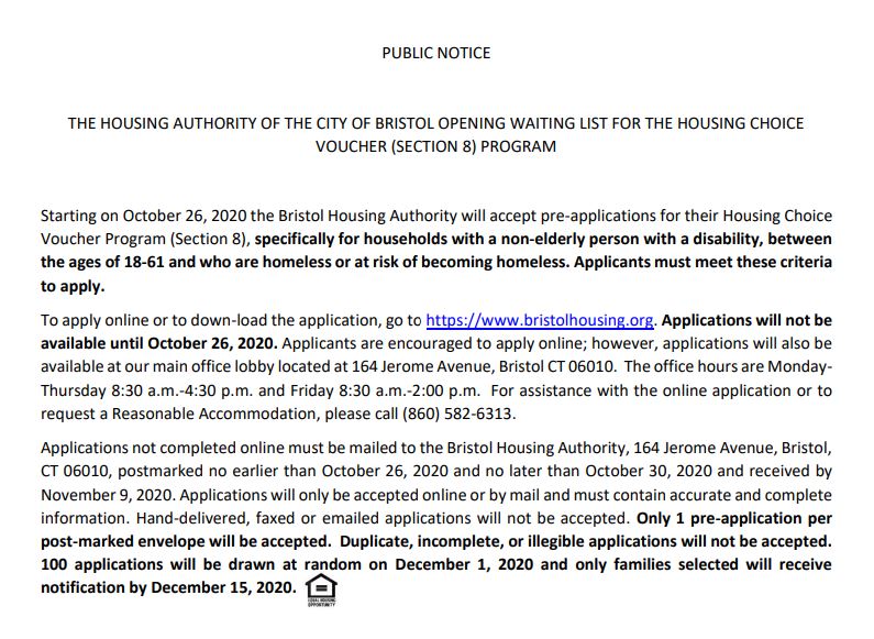 Starting on October 26, 2020 the Bristol Housing Authority will accept pre-applications for their Housing Choice Voucher Program (Section 8), specifically for households with a non-elderly person with a disability, between the ages of 18-61 and who are homeless or at risk of becoming homeless. Applicants must meet these criteria to apply. To apply online or to down-load the application, go to https://www.bristolhousing.org. Applications will not be available until October 26, 2020. Applicants are encouraged to apply online; however, applications will also be available at our main office lobby located at 164 Jerome Avenue, Bristol CT 06010. The office hours are Monday-Thursday 8:30 a.m.-4:30 p.m. and Friday 8:30 a.m.-2:00 p.m. For assistance with the online application or to request a Reasonable Accommodation, please call (860) 582-6313.