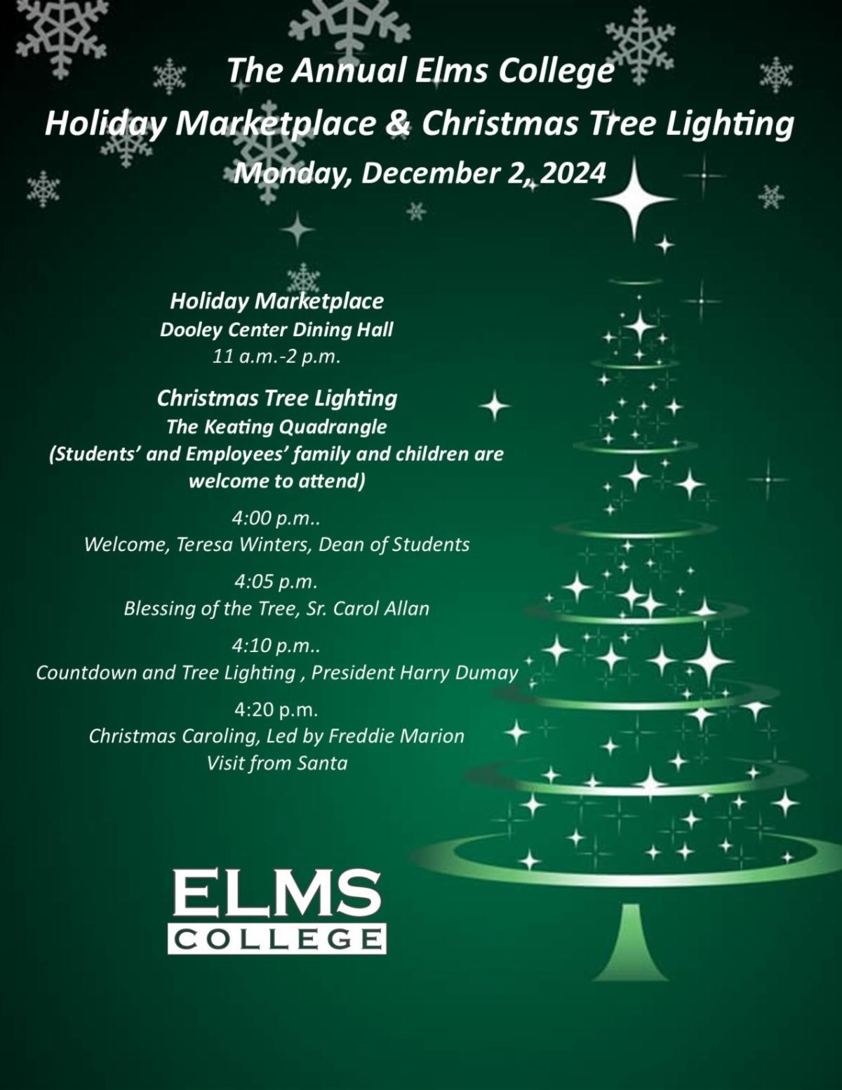 Elms College will be holding our Annual Holiday Marketplace on Monday, December 2 from 11:00 am-2:00 pm. On top of inviting alumni to this event, we are looking for members of our community to participate by selling homemade items no direct sales vendors please. (ex. Young Living, Color Street, Tupperware). There is no table fee, but we ask that you please donate an item that will be raffled off at the end of the event. The event will take place indoors in the Dining Hall and you will be provided with one 8 ft table and two chairs. | |