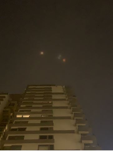 “I was standing outside my building and then looked at the sky. It was cloudy, but lights appeared in the sky above my building: one orange [-shaped] form with two blue lights and one orange and aside from that was another orange light. I took a phone call and [the] next time I looked [into] the sky, about 10 minutes later, nothing was there anymore. No sound and [no] moving shape.”