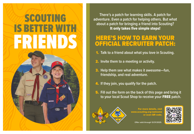 In support of your Fall 2025 recruiting efforts with all of our Scout youth, Scouting America Outfitters is excited to announce a new Recruiter Strip program to reward your Scouts for inviting a friend! Starting immediately, the two-sided flyer shown above (click here to download) is available to promote our FREE Recruiter Strip emblems available to all Scouting youth.