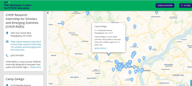 This Philadelphia STEM Program Directory is a free, searchable map that highlights a wide range of in-person, out-of-school-time STEM opportunities across the Greater Philadelphia area. Students can search for programs based on their interests—from sports analytics and artificial intelligence to marine science and engineering—as well as by grade level (pre-K through 12th grade) and when and where programs are offered. For teachers and educators, the Directory also includes a Professional Development section that can be filtered by interests, grade level, incentives, and aligned educational standards.
