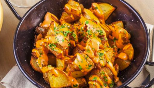 Patatas Bravas is a hot and spicy potato tapas menu item popular in Spain.