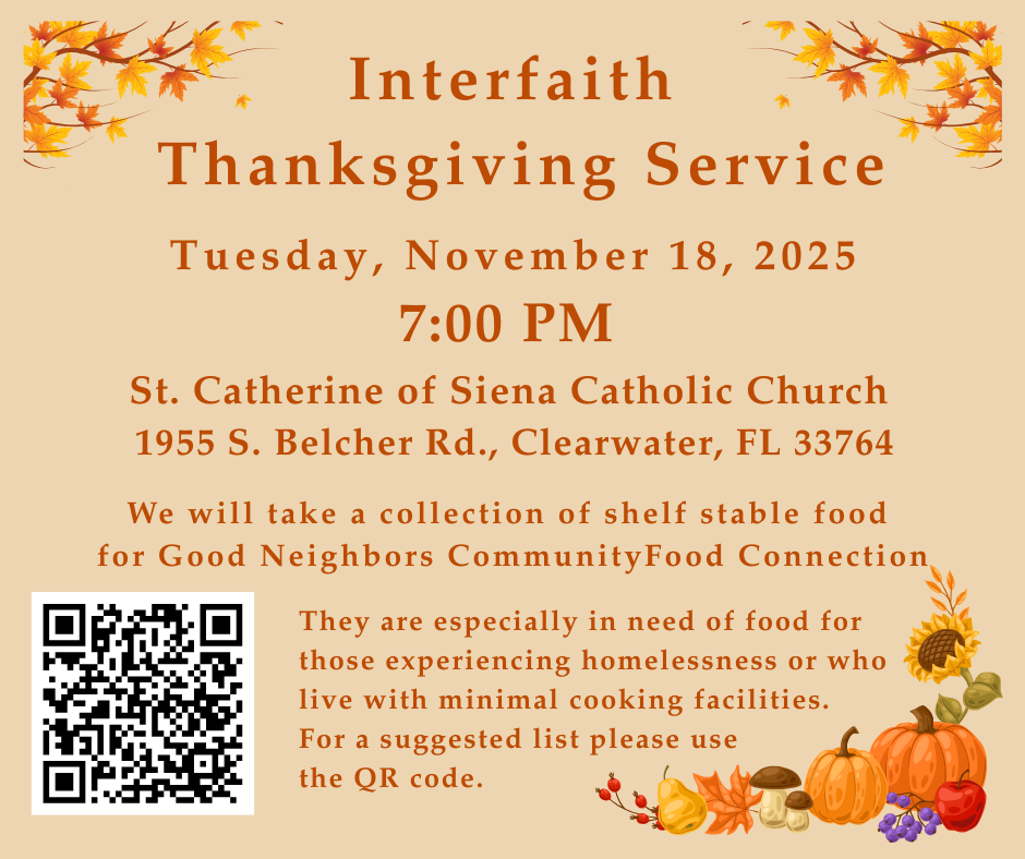 November 18 Interfaith Thanksgiving Service, 7 p.m., St. Catherine of Sienna