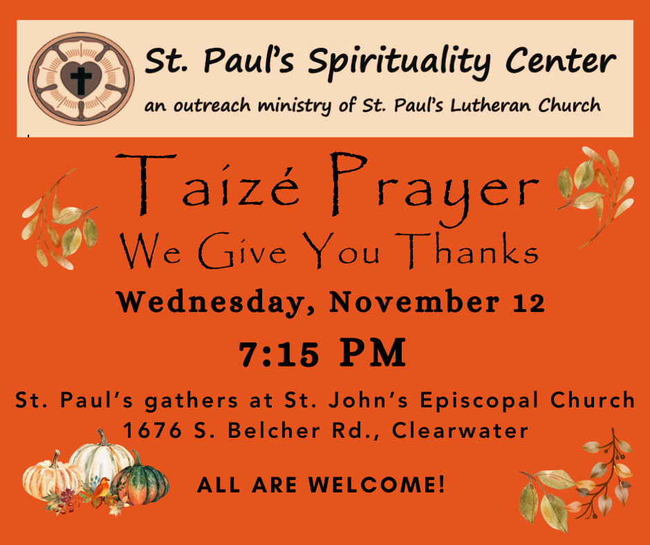 St. John's and St. Paul's will join together for the second year in a row for a Thanksgiving Dinner. It will be held on Wednesday, November 12 at 5:30 p.m. Turkey will be provided. Bring a dish to share. Please note the time change from 5 to 5:30.