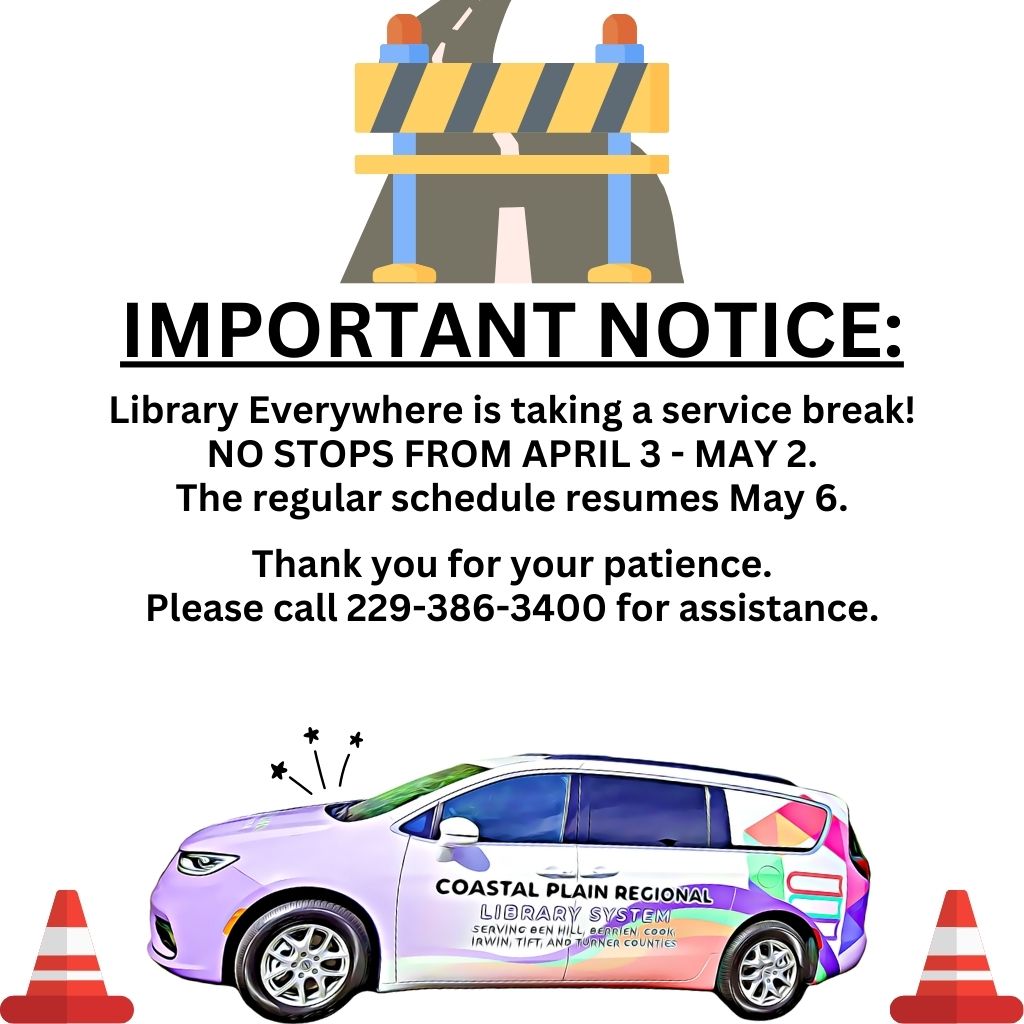 Library Everywhere will be taking a short break from April 3rd to May 2nd, with regularly scheduled stops resuming on Tuesday, May 6th. If you have something checked out, Library Everywhere will be marked as “closed” in the PINES system, so all late fees will be paused during this time. Should you receive any late fees, please contact the Coastal Plain Regional Library at 229-386-3400 or 229-402-9115 with your library card number, and we’ll assist you. Thank you for your understanding. Library Everywhere will be back soon!