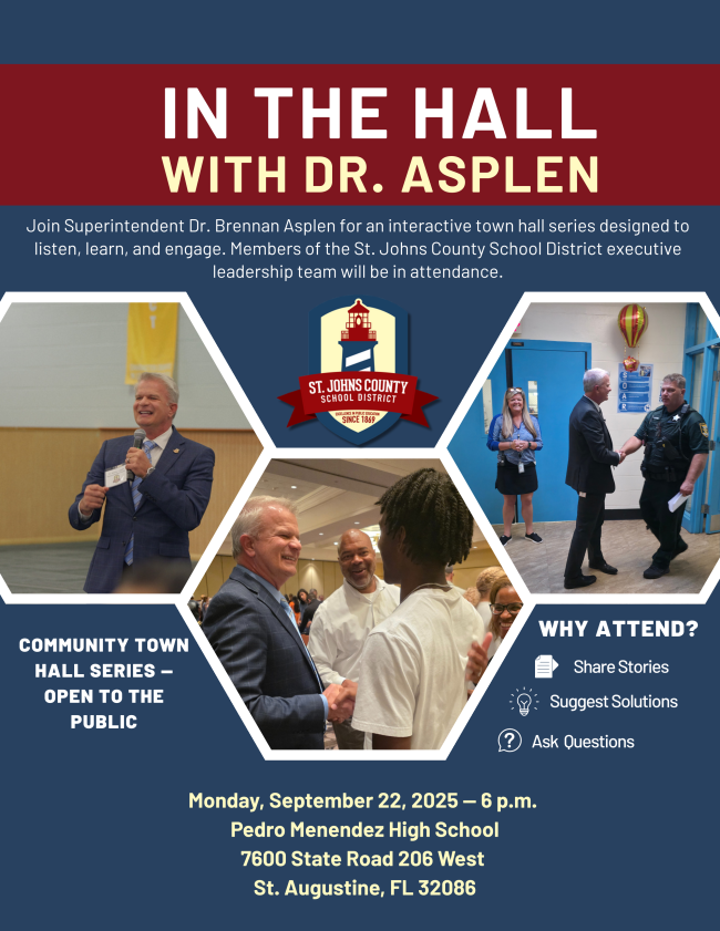 This week is a shortened week as our faculty will be engaged in professional learning around the county on Friday. These days are very important to teachers as they hone their craft and gain resources, research and strategies to aid each student in achieving their full potential. These trainings are available, in part, with resources from the millage funds and we are very thankful to the St. Johns county community for this support. This week we have a number of athletic events, including a home football game this Thursday versus Ponte Vedra High School at Veterans Stadium. We will also be re-dedicating the Veterans Wall that night at 6:30pm and honoring all who have served our great nation. The week is capped with two performances, Friday and Saturday at the Menendez Performing Arts Center.