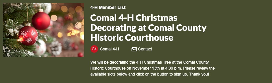 We will be decorating the 4-H Christmas Tree at the Comal County Historic Courthouse on November 13th at 4:30 p.m. If you would like to participate, click the SignUp Genius button below! | |