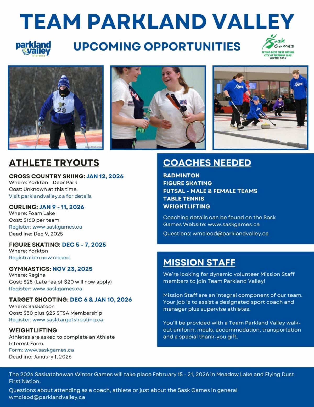 We’re heading to the Saskatchewan Winter Games this February, and we want you on our team! Athlete tryouts are happening across the district, and we’re also looking for coaches and volunteer mission staff to join our team. Mission Staff volunteers play a key role in supporting athletes and coaches, while experiencing the excitement of the Games up close.