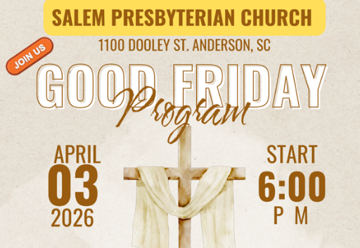 Thursday, April 30 at Noon at First Church (Spartanburg) 393 E. Main St, Spartanburg