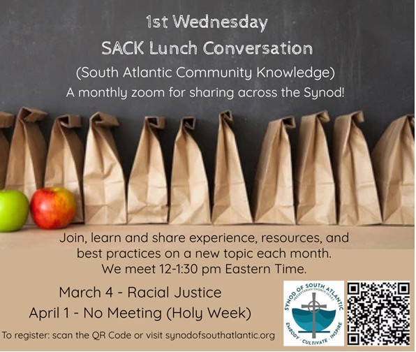 A monthly Zoom for sharing across the synod! Join, learn and share: experience, resources, and best practices on a new topic each month. We meet on the first Wednesday of the month from 12-1 pm (Eastern Time).